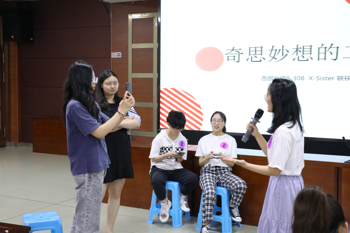 第一个上场的是来自杏园女寝8-403的六神花露水寝室,小学教育专业的她们通过对游戏化教学的思考,想到可以用游戏导入一个新的知识点,也可以用游戏复习学过的知识。一堂简短的模拟课、一局“你来比划我来猜”的游戏,将她们的专业知识与团体协作的打卡内容完美融合。