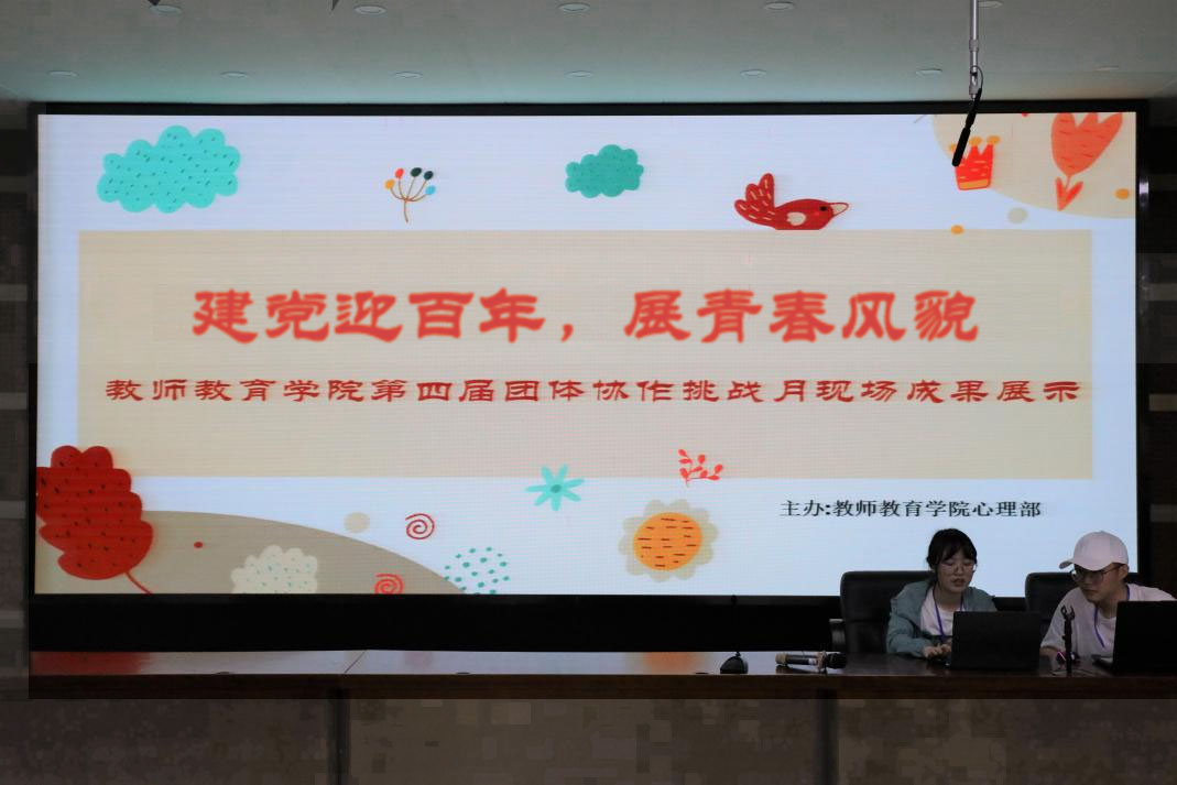 恰逢中国共产党成立一百周年即将来临,习近平总书记在新年贺词中对中国青年提出殷切希望:“站在‘两个一百年’的历史交汇点,全面建设社会主义现代化国家新征程即将开启。征途漫漫,惟有奋斗。我们通过奋斗,披荆斩棘,走过了万水千山。我们还要继续奋斗,勇往直前,创造更加灿烂的辉煌!”而当代青年“佛系”“丧”“内卷”等现象层出不穷。为了更好地帮助同学们告别丧文化,培养积极心理,充实生活,完善自身,为复兴中国梦贡献自己的力量做好准备。教师yl6809永利官网心理辅导分站特开展“迎建党百年,展青春风貌”——团体协作挑战月活动。5月7日晚,教师yl6809永利官网“团体协作挑战月”活动决赛于17幢112报告厅举办。初阳学院学工办主任曹玮老师、辅导员蒋栩璐老师、教师yl6809永利官网辅导员蒲伟军老师出席并担任了本次活动的评委。