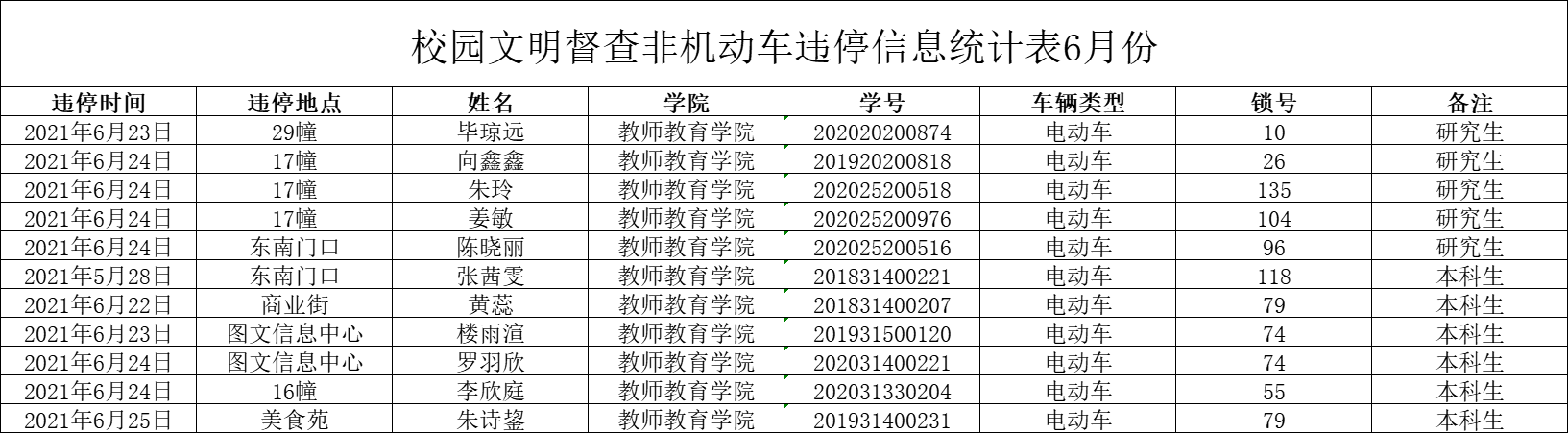 6月份共违停11人,其中研究生5人 ,本科生6人。