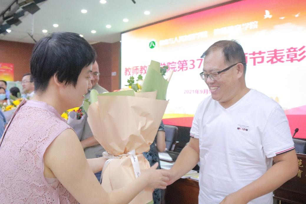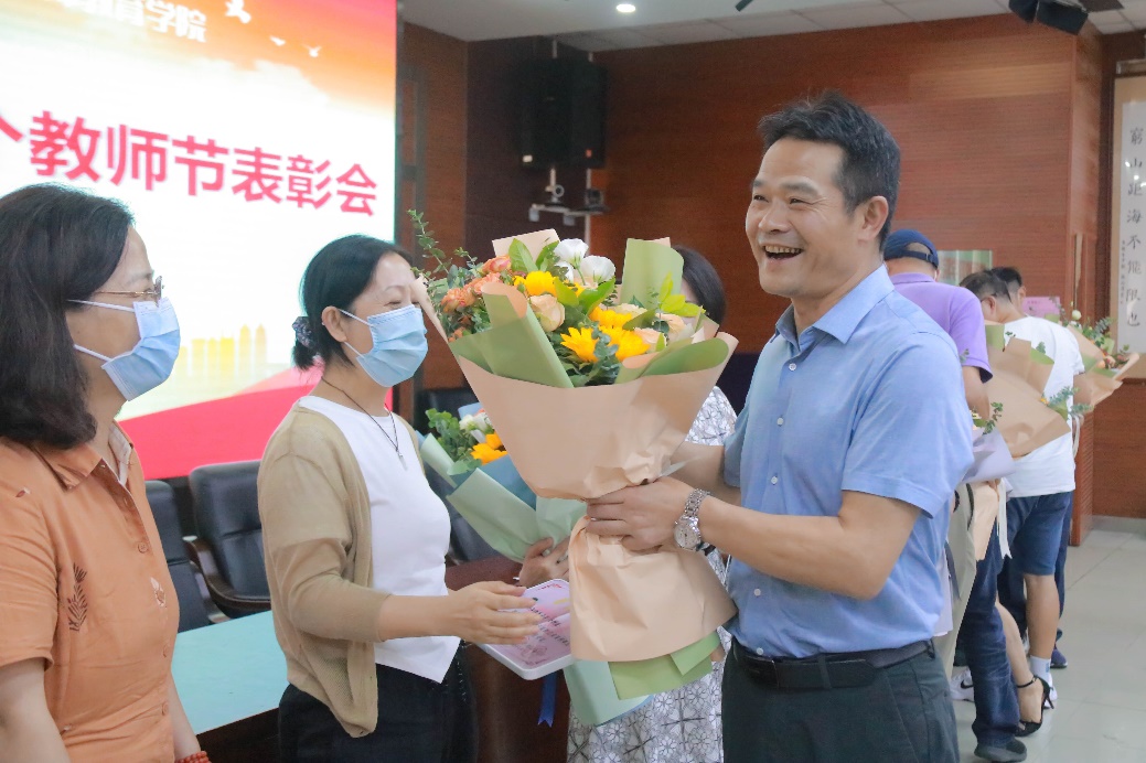 黄良英老师对全体荣誉获得者及其奖项名称依次进行汇报,周跃良院长和查颖书记为获奖者颁发奖状、献上鲜花。最后向全院教工送上了教师节祝福和礼物。